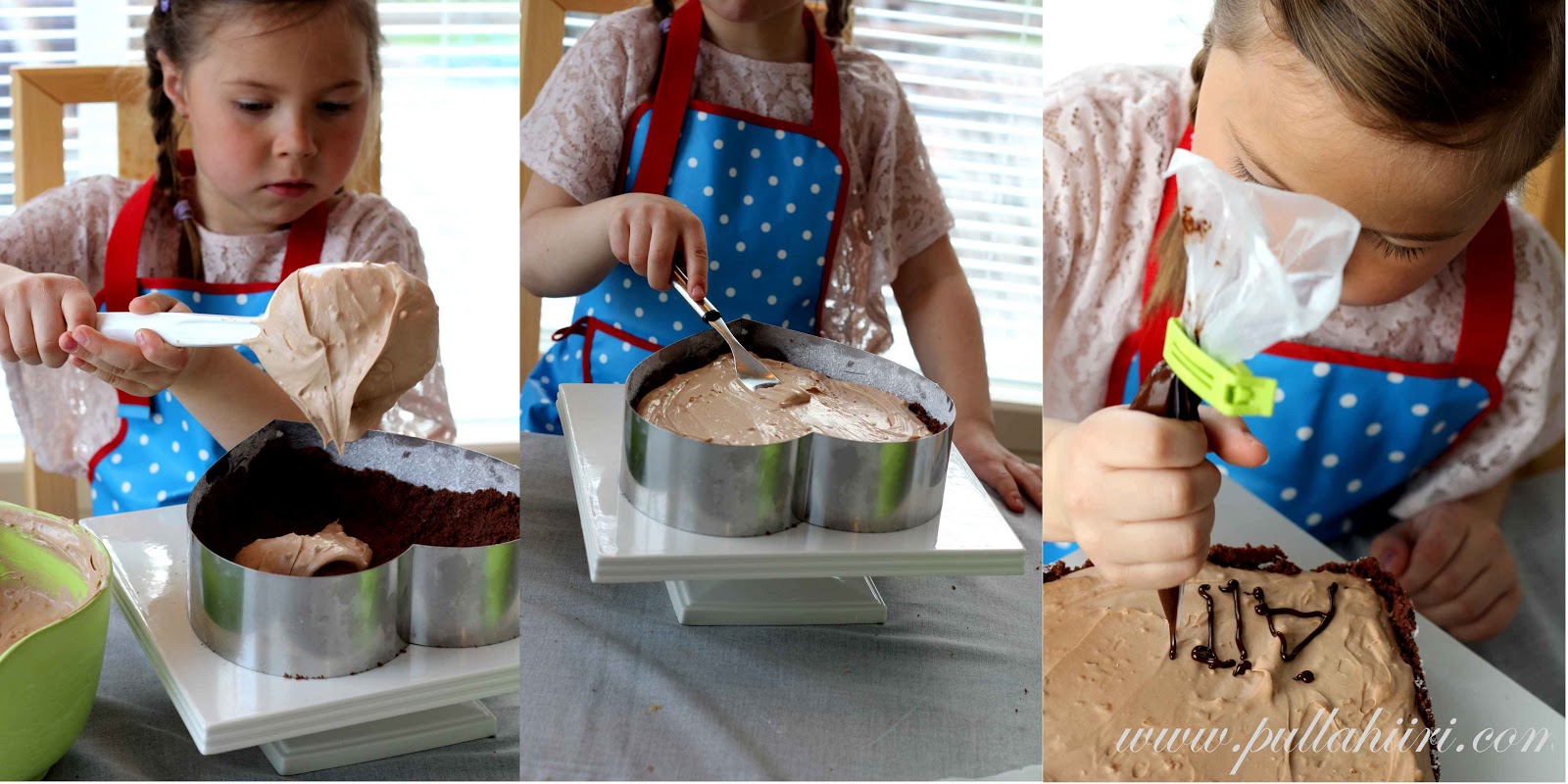 Huomio! Kuten tarkkasilmäiset voivat kuvista huomata, niin minä neuvoin neitiä tomusokeroimaan tuon reunuksen, koska alunperin oli ajatuksissa laitaa keksit vain pohjalle. Tällöin tuo reunuksen öljyäminen ja tomusokerointi tekee kakun reunasta kauniin. Nyt kuitenkin nostimme lopulta tuon keksimurskan myös kakun reunoille, jolloin tuo tomusokerointi on aivan turha ja oikeastaan rumentaa keksireunusta. Eli tässä en suosittele tekemään tuota tomusokerointia kuin vain siinä tapauksessa, että pohjan keksimäärää pienentää ja laittaa keksit vain pohjalle.