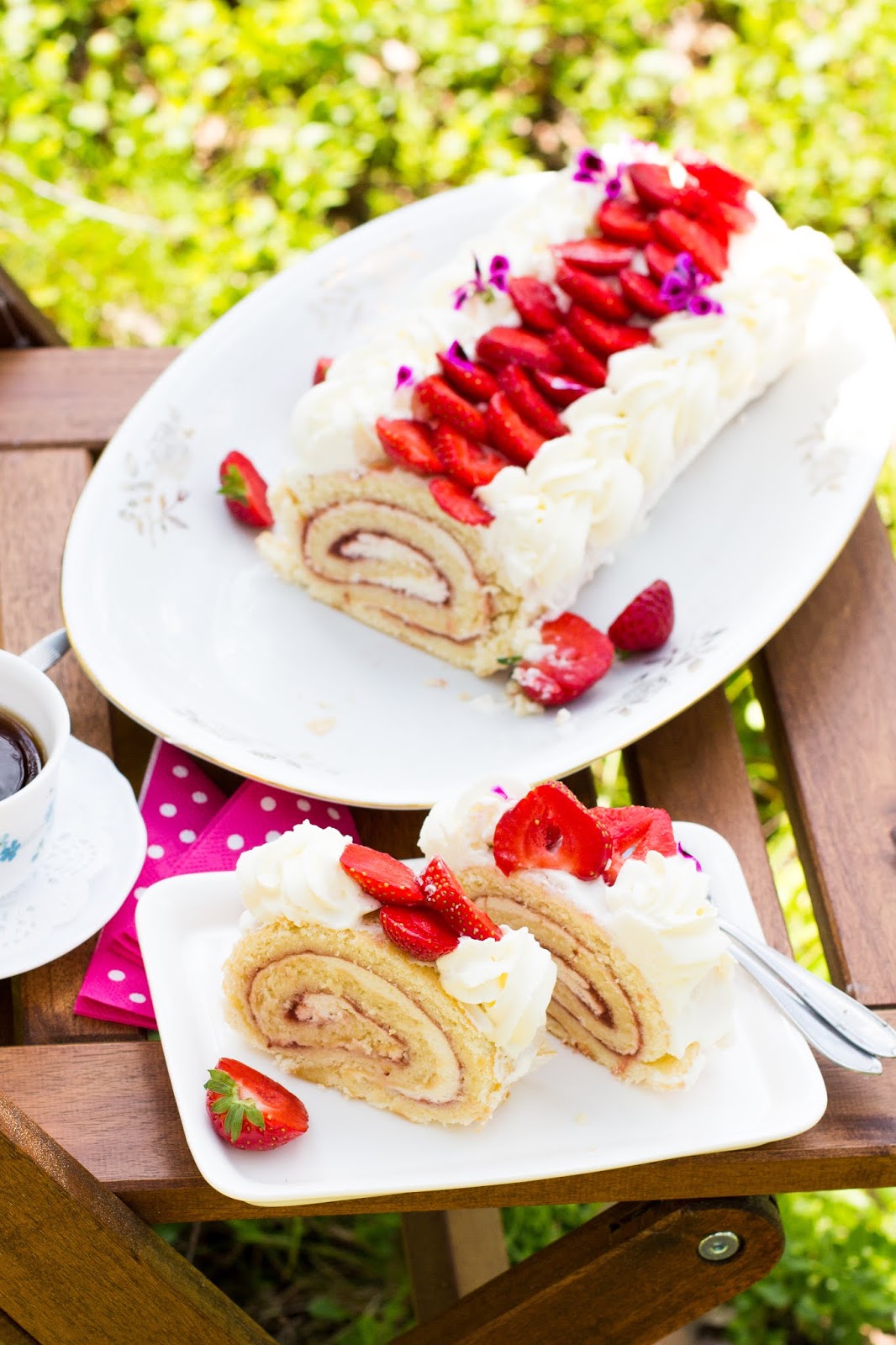 Minä tein herkullisen mansikkakääretortun mökkijuhannusta varten. Pyöräytin kääretortun rullalle jo kotona, joten mökille jäi tehtäväksi vain kääretortun koristelu. Kesällä on ihana käyttää tuoreita marjoja koristeluun ja myös täytekakkujen ja muiden leivonnaisten täytteeksi, koska niitä on nyt todella hyvin tarjolla. Tällä kertaa kuitenkin täytin kääretortun mansikkamareladilla ja ohuella kermatäytekerroksella. Koristeeksi käytin ihania mökkimme lähitilalla kasvaneita mansikoita. Yleensä kääretorttuja ei kostuteta, mutta minä tein tällä kertaa poikkeuksen, koska halusin kääretortusta oikein mehevän ja maultaan täytekakkua muistuttavan.