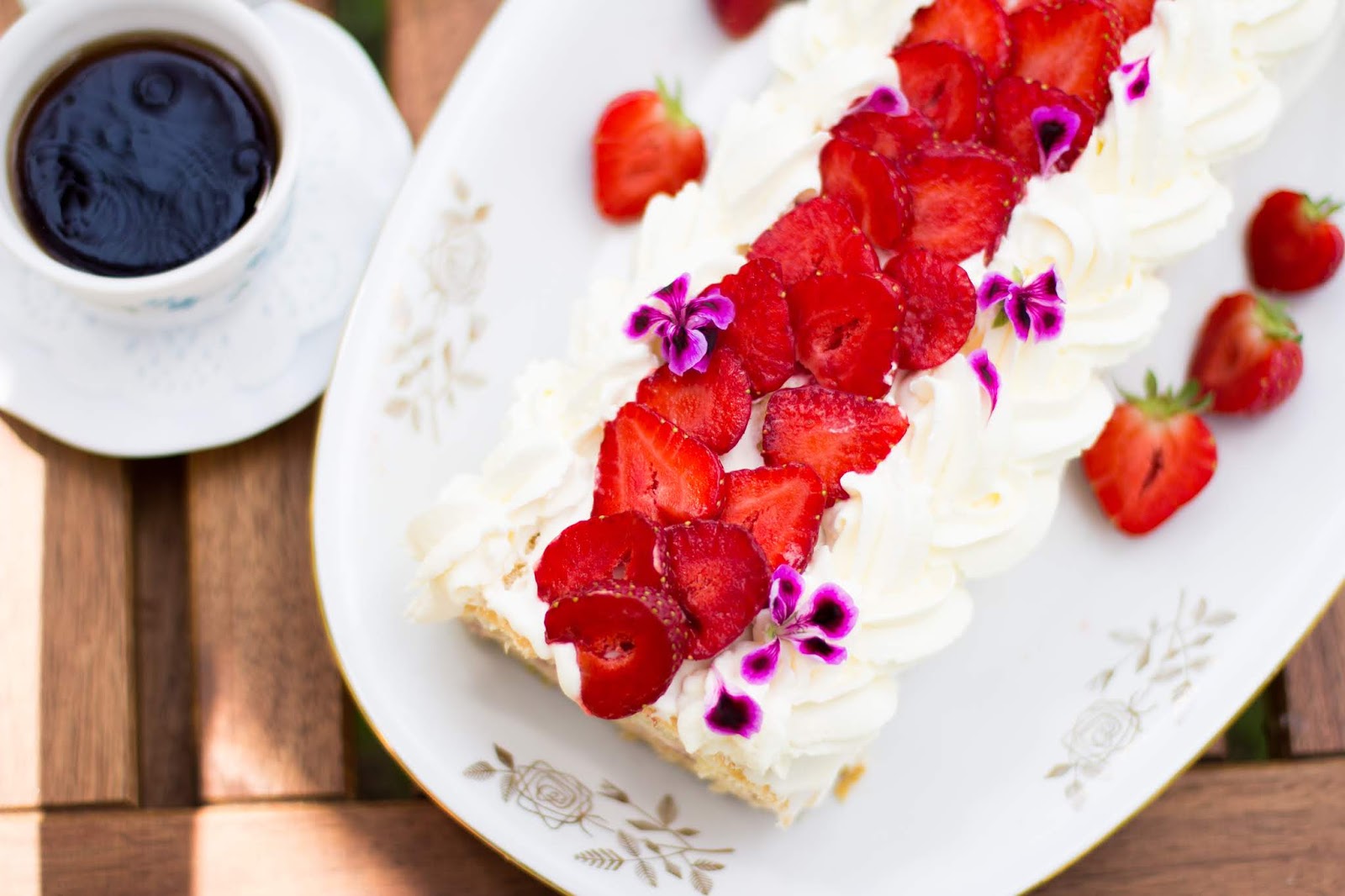 Kuorrutin kääretortun kermavaahdolla ja koristelin sen tuoreilla mansikoilla ja syötävillä kukilla. Valmistin kääretortun leveällä 60 cm uunin uunipellillä.
