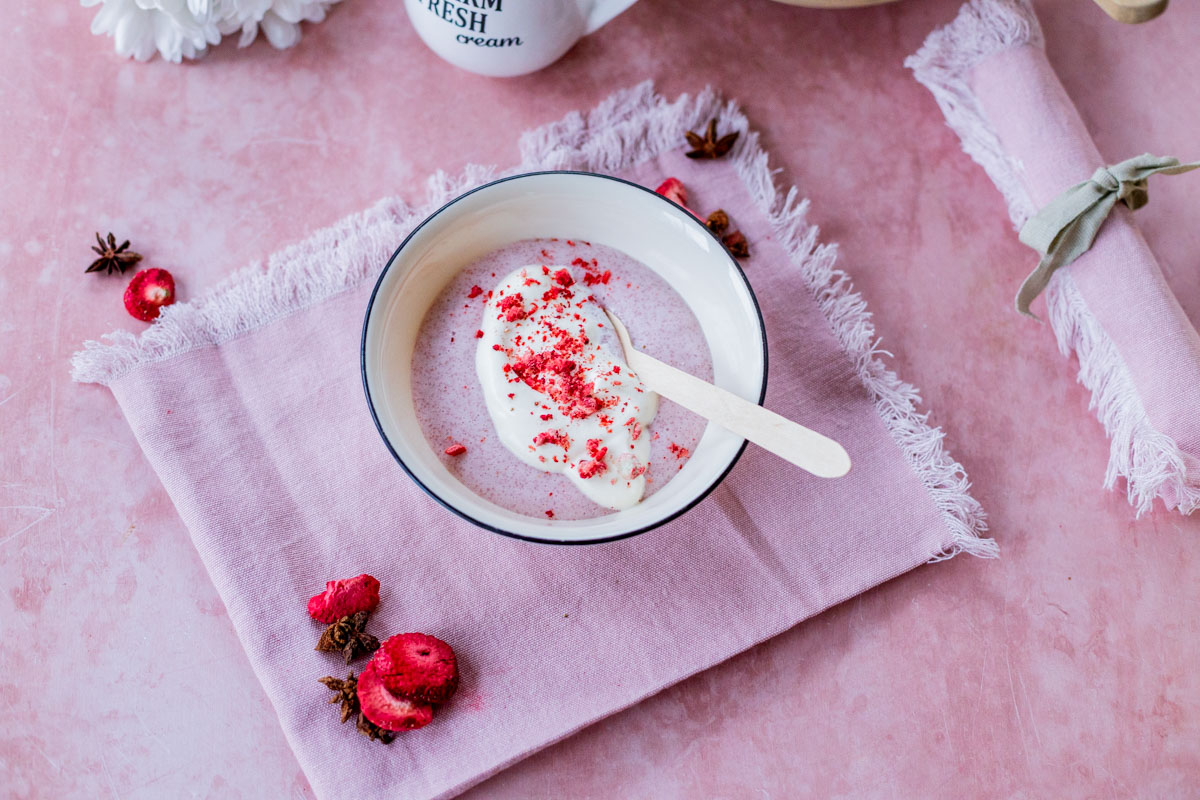 Tarjoile puuro löysän kermavaahdon kanssa, tai lisää puuroannoksen joukkoon kerma suoraan purkista. Minä viimeistelin nämä annokset vielä pakastekuivatulla mansikalla.
