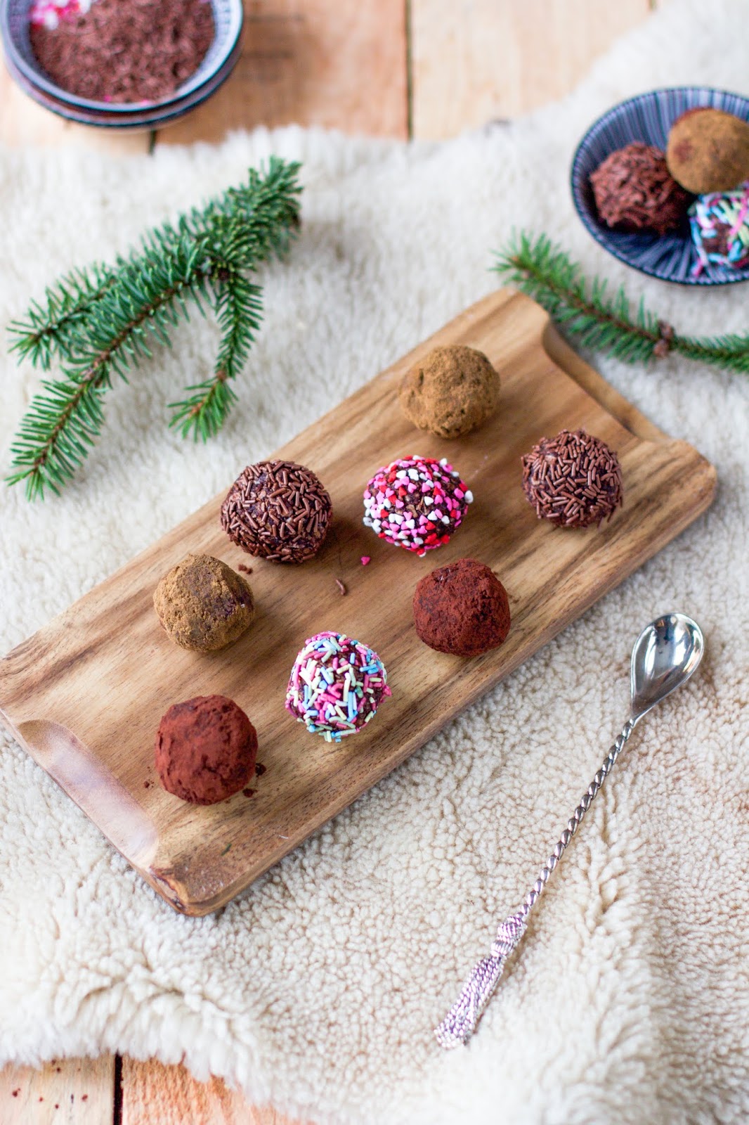 Pyörittele massa 18 palloksi. Valitse haluamasi koristeet ja pyörittele pallot niissä. Nämä kaakaopallot ovat herkuteltavissa vaikka heti valmistumisen jälkeen.