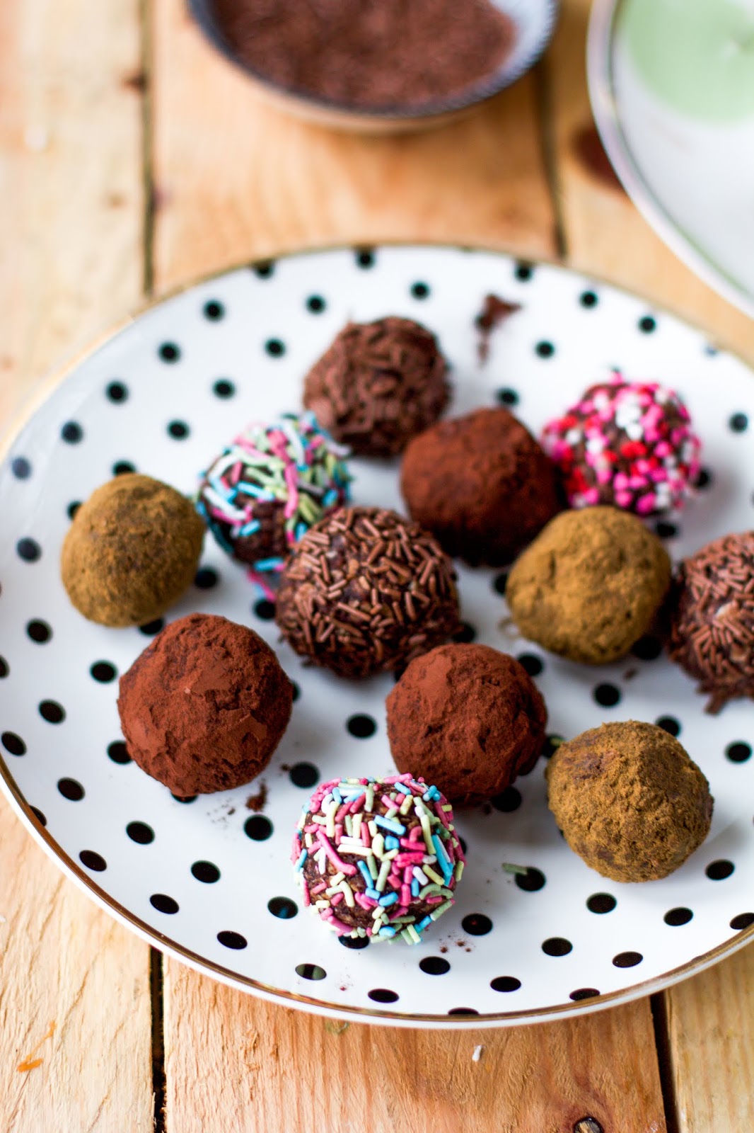 Nämä herkulliset kaakaopallot valmistuvat todella nopeasti ja näitä on helppo valmistaa myös pienten lasten kanssa. Ainekset vain sekoitellaan keskenään ja valmiit pallot pyöritellään valitussa koristeessa. Näissä voit käyttää koristeena esimerkiksi kaakaojauhetta, lakritsijuurijauhetta, kookoshiutaleita, stösseleitä, nonparelleja tai muita pallojen pinnalle sopivia koristeita.