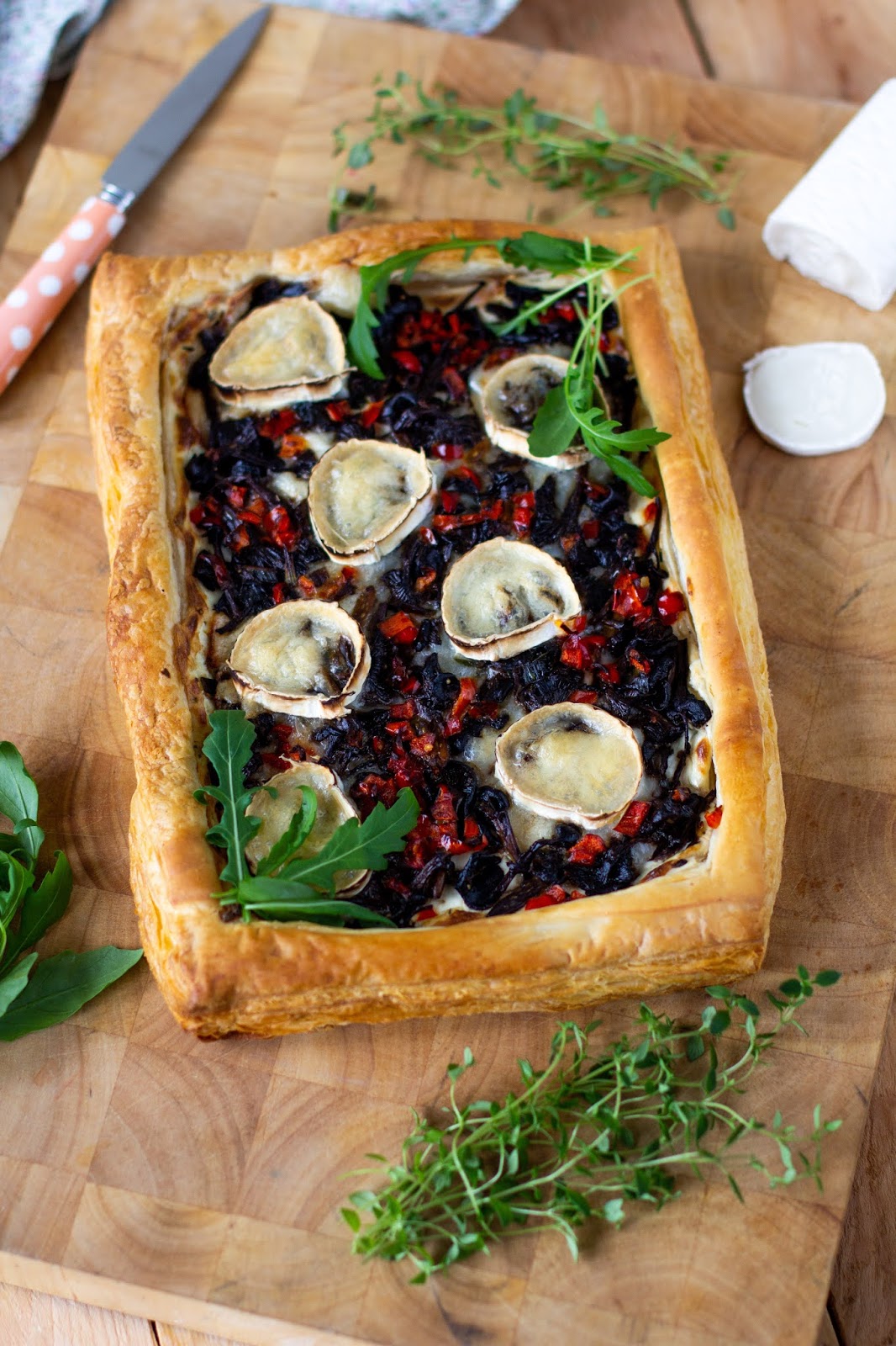 Sienikerroksen alle tein maustamattomasta tuorejuustosta täytekerroksen ja sienien päälle paloittelin hieman vuohenjuustoa. Nämä käyttämäni juustot tekevät tästä sienipiirakasta täyteläisen ja antavat hyvää lisämakua.