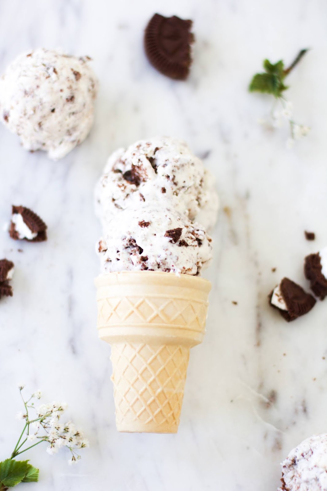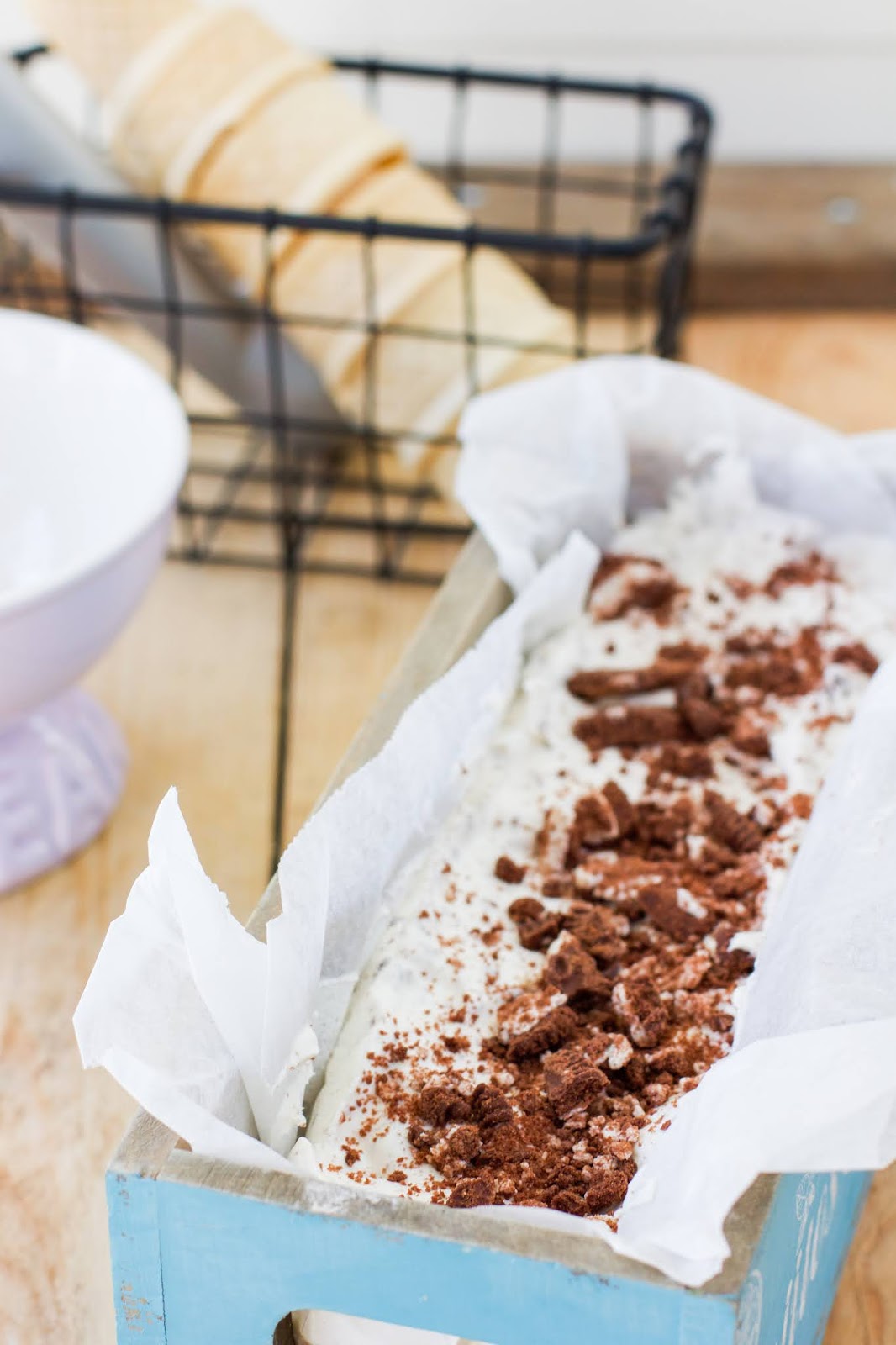Tämän jäätelön valmistamiseen tarvitset vain kolme ainesta. Yksi aineksista on kondensoitu maito, joka makeuttaa jäätelöä ja pitää koostumuksen ihanan samettisena. Tällä kertaa murustelin jäätelömassan joukkoon keksimurskaa, mutta periaatteessa sama kahden aineen jäätelöpohja on muunneltavissa myös muihin makuihin. Miten ihanaa olisikaan esimerkiksi kinuski-pähkinäjäätelö, tai vaikka Nutellalla maustettu jäätelö?