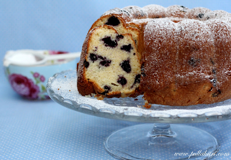 talviaikaan käytin kotimaisia pakastemustikoita tähän kakkuun ja