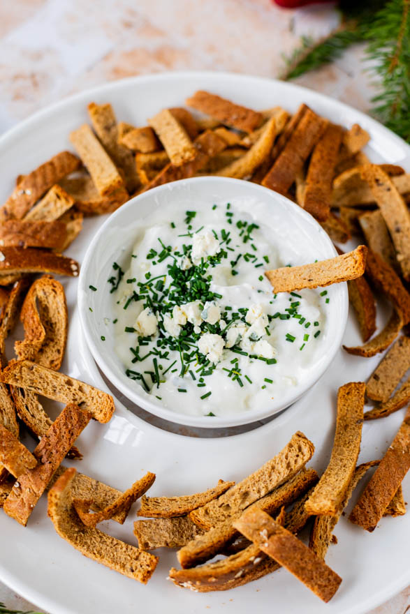 Minä hyödynsin tämän dipin kanssa voileipäkakusta ylijääneitä paahtoleivän reunoja, jotka kuivatin uunissa uuniruoan jälkilämmössä noin puolisen tuntia.